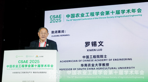 中国工程院院士罗锡文致闭幕辞,他指出,学会全体会员应以本次年会为集结令,迅速集结再出发,向着新的目标不断前进。他希望,青年科技工作者应自觉担负起光荣的使命和责任,以新实践、新成果开创农业工程的新纪元。
